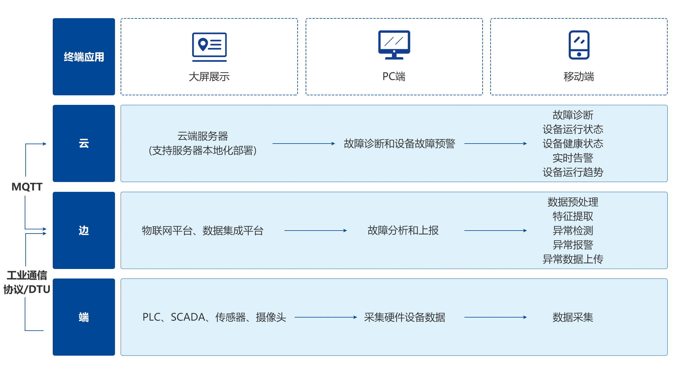 工业设备健康管理系统包含设备运行在线监测和预测性维护等功能,主要针对在生产中相关设备的电气故障和机械故障做实时监测,整套系统结合物联网实时监测技术和算法模型预测技术来准确识别和预报设备故障,发现潜在隐患和风险,实现预测性维护,有效保障设备安全运行,降低运维成本。