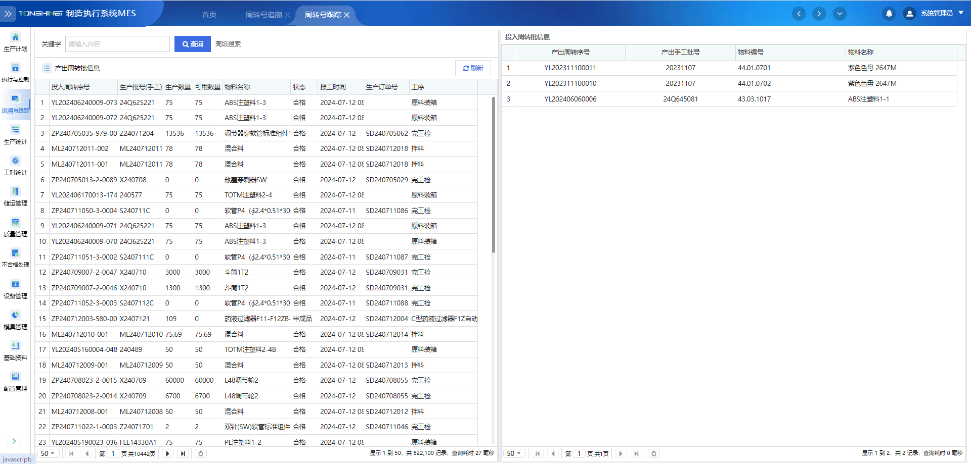 追溯与跟踪模块用于周转批、生产批的追溯与跟踪。可以直观的查询投入周转批的产出周转批信息和生产批的产出生产批信息。