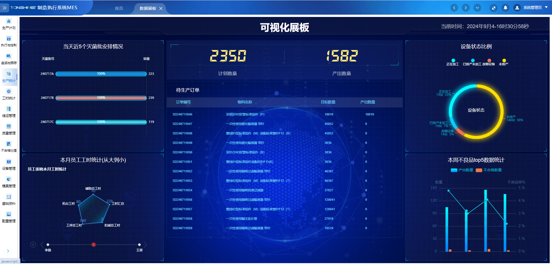 采用可视化大屏的形式,实时展示生产订单排产情况、待生产订单、设备状态等情况,同时分析每周的不良品情况和员工工时情况。