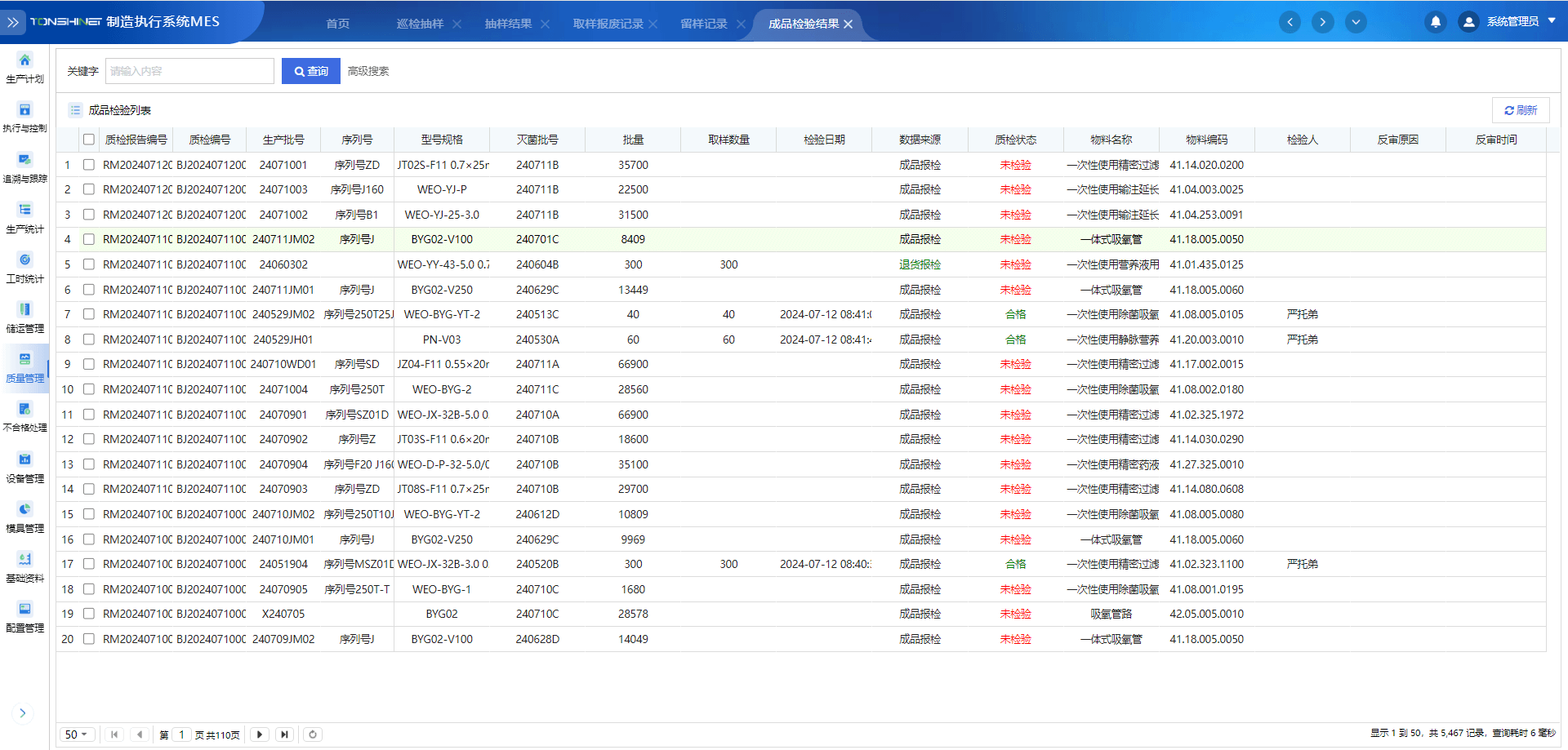 该模块包含组配件待检、巡检抽样质检、不合格品处理、报废和返工管理。覆盖生产过程中的质检环节,对于工序中的抽样,如果不返还样品或者部分返还样品,则需要对不返还的物料进行报废处理。