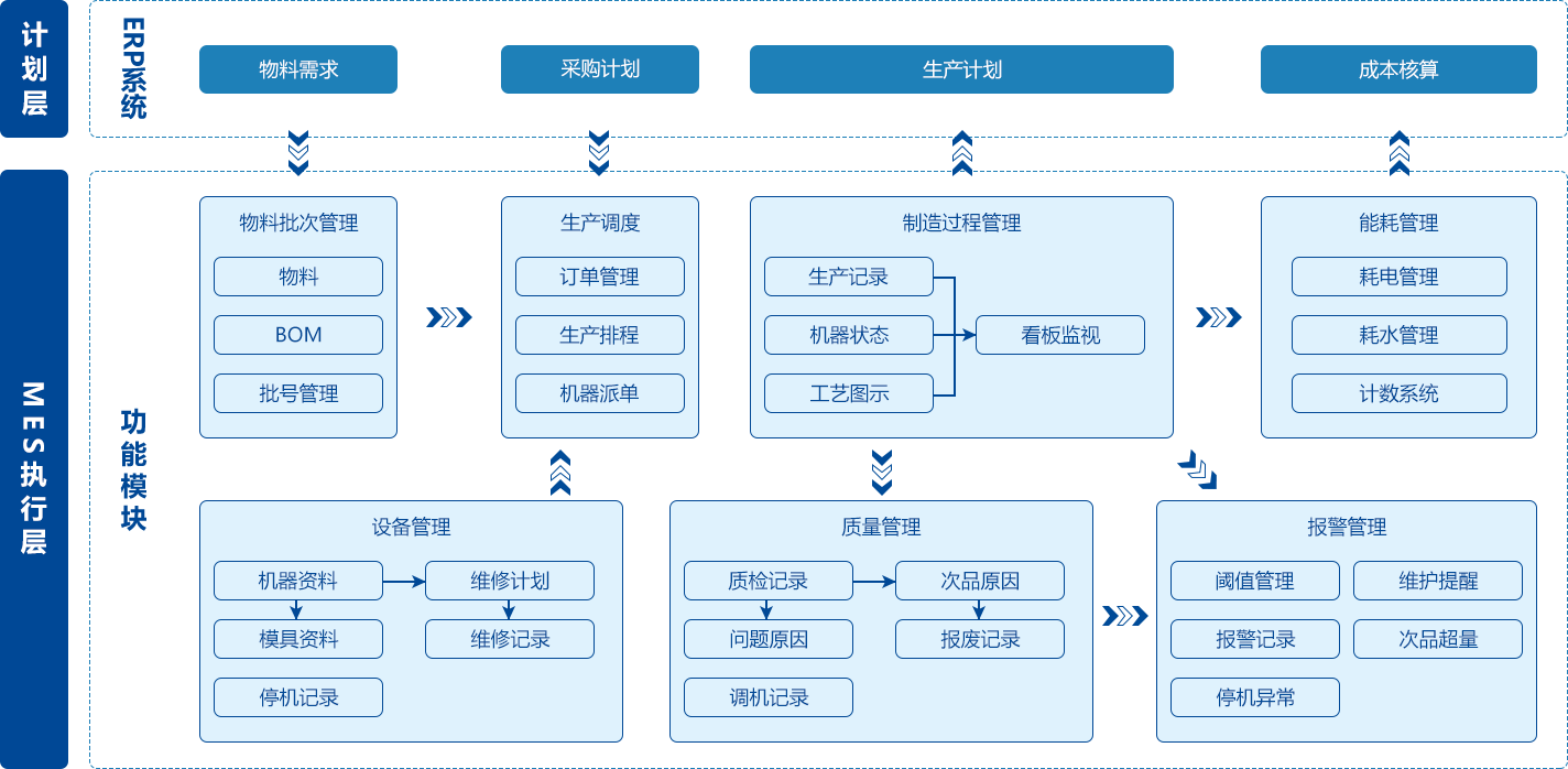 制造执行系统(MES)是一种用于优化从订单下达到产品完成整个生产过程的管理系统。MES系统主要包括生产管理、工艺管理、过程管理和质量管理等功能。它通过条码技术跟踪产品从物料投产到成品入库的整个生产流程,实时采集生产过程中发生的所有事件,使整个工厂车间完全透明化。