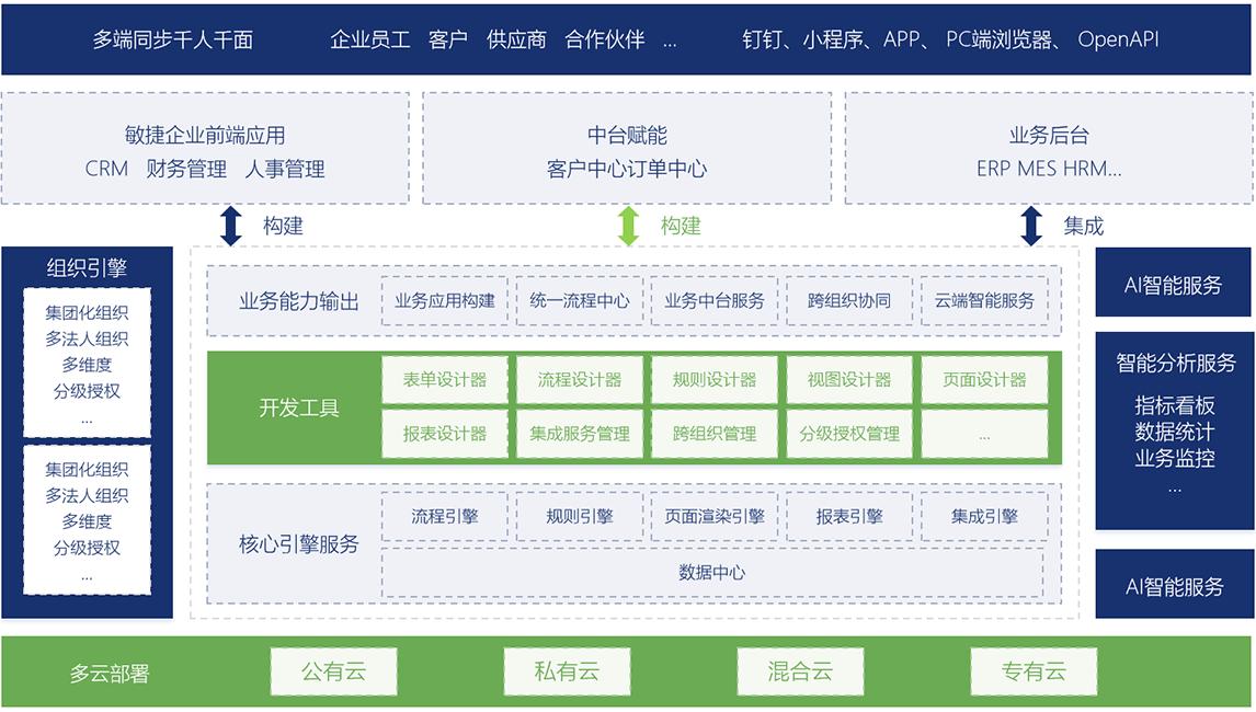 擎天低代码开发平台支持多租户、跨系统集成和开发,提供低代码开发框架和流程引擎驱动,集成智能分析服务和业务组件封装,为企业实现业务系统快速搭建提供有力支撑。平台整合前端展示、系统集成、组织引擎、低代码开发、AI智能服务等核心技术,支撑跨平台部署和调用,保障企业多维数据融合,打通业务数据壁垒,实现对企业全流程数据统一分析、展示,支持数据灵活共享,打破企业内部数据壁垒。