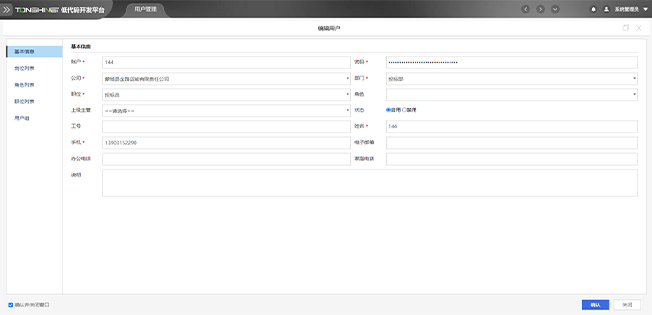 平台提供多层级用户管理,可添加用户、修改用户资料、删除用户信息、禁用用户、查看个人资料、修改用户所属部门、修改用户各种操作权限和管理范畴等。
