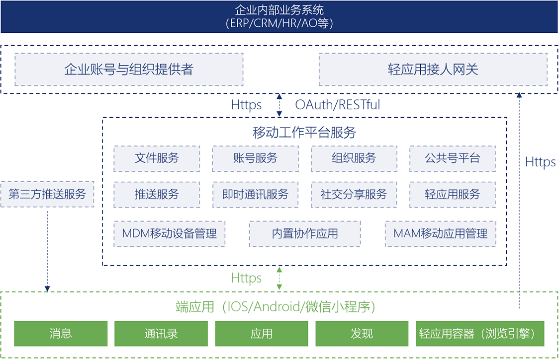 移动工作平台支持IOS、Android、Desktop、Web多客户端同步,为企业实现业务系统快速移动化提供基础设施,封装成多种基础服务组件提供给业务系统调用。用户可以使用平台进行单人及多人群组消息沟通、查看带有组织架构的通讯录、快速访问应用(本地应用、轻应用)入口,发现和分享业务动态;基于消息驱动应用业务,企业内部业务系统将消息通过消息推送到用户移动客户端,用户收到消息后直接访问轻应用,可以实现最及时的业务处理。