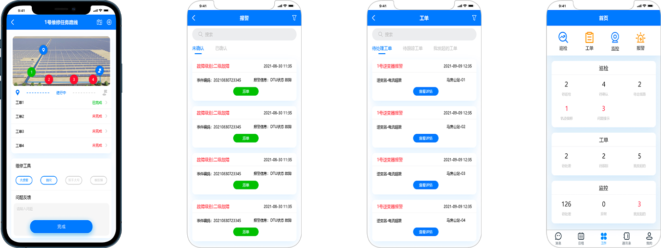 实现对光伏电站的移动化运维,可通过手机查看设备运行状况,整合工单系统,实现任务的派发、规划和执行的全方位闭环管理。