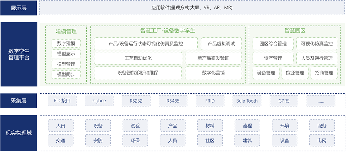 数字孪生管理平台包括建模管理、智慧工厂、智慧园区、工业AI算法四大部分。通过多维融合,提供轻量化建模并导入三维引擎,结合工业物联网平台能力实现数字孪生体的搭建;利用智能AI,提供设备预警、设备工艺优化、制造流程、园区安防、人员追踪的AI方案,实现协调优化和多点创新。